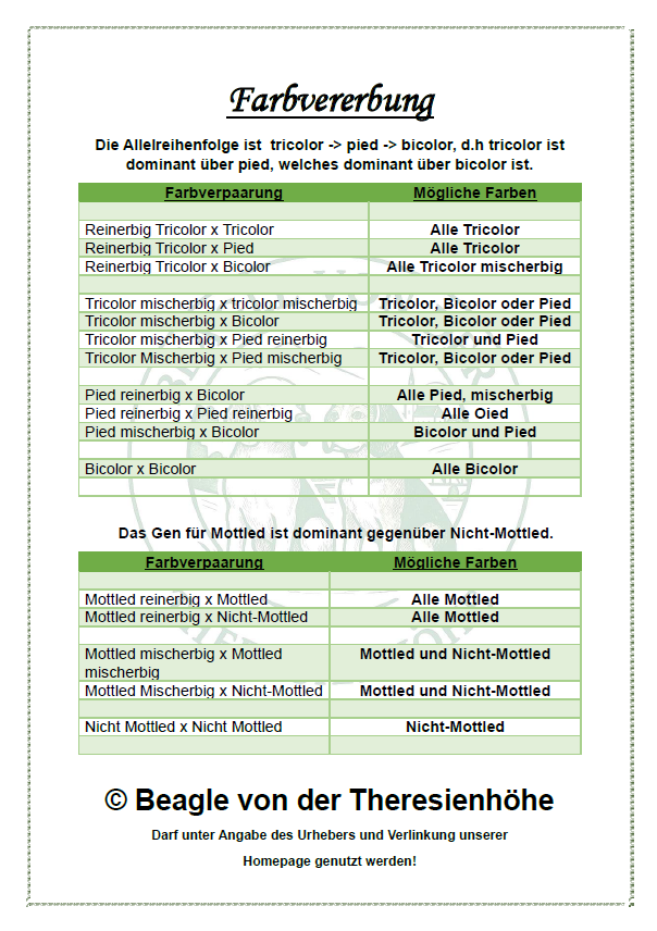 Beide Bilder zeigen unseren ersten Mottled Welpen "Eddie Hunter´s Love v.d. Theresienhöhe. Fotografiert von: K&K Fotografie WhiteNoch ein bisschen Farbgenetik bzw. FarbvererbungWissenswertes zur Farbvererbung beim Beagle Die Genetik der Farben ist ein faszinierendes Thema, aber auch sehr komplex. Um euch zu verdeutlichen, wie die wunderschönen Farben unserer Beagle entstehen, haben wir hier eine Übersicht zur Farbvererbung für euch bereitgestellt. Ein wichtiger Hinweis zum Urheberrecht: Die Grafik darf gerne unter folgenden Bedingungen geteilt und weiterverbreitet werden: