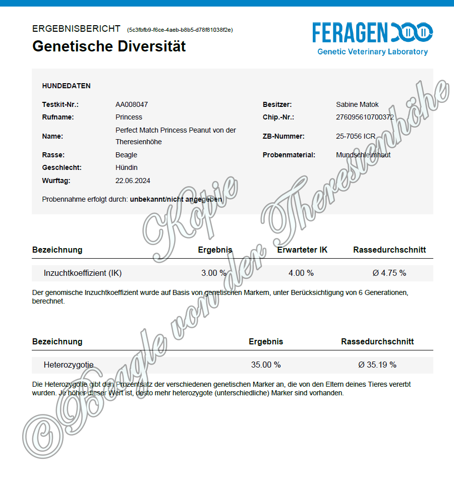 Genetische Vielfalt & Verantwortung Ein besonderer Meilenstein ist uns mit diesem Wurf gelungen: Durch die gezielte Auswahl der Anpaarung konnten wir mit Princi den Inzuchtkoeffizienten (IK) weiter senken. In der modernen Rassehundzucht ist dies ein entscheidender Faktor, um die Vitalität, Fitness und langfristige Gesundheit der Linie zu sichern.