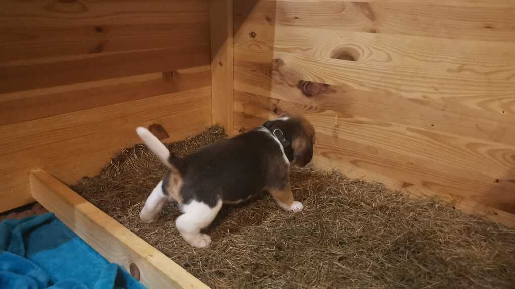 - Die offene Tür: Die Box steht anfangs immer offen im Auslauf. Sie wird mit kuscheligen Decken und vertrautem Spielzeug ausgestattet, sodass die Welpen sie von sich aus neugierig erkunden können.